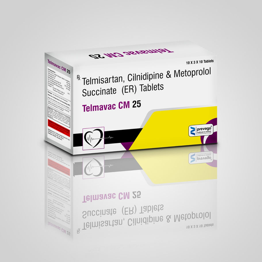 TELMAVAC CM25 is a clinically formulated combination medicine containing Telmisartan 40 mg, Cilnidipine 10 mg, and Metoprolol 25 mg, designed to help manage high blood pressure (hypertension) effectively. This triple-action therapy works through complementary mechanisms to provide better blood pressure control and reduce cardiovascular risk.