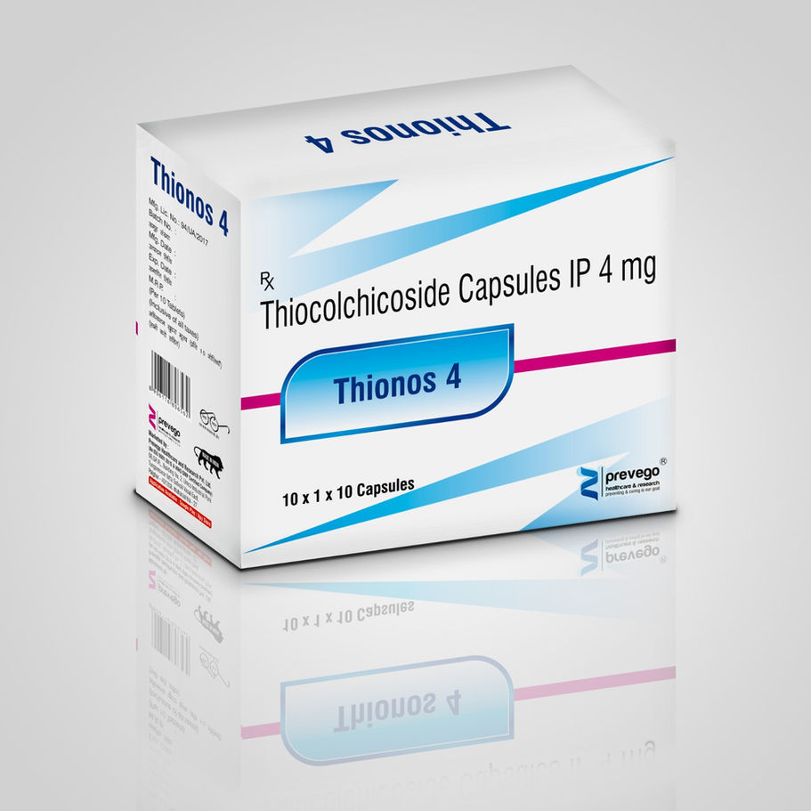 THIONOS 4 contains Thiocolchicoside 4 mg, a muscle relaxant used to relieve painful muscle spasms and musculoskeletal conditions. Thiocolchicoside works by acting on the central nervous system to reduce muscle stiffness and improve muscle relaxation.